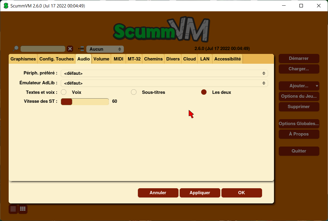 Pour ScummVM et les options, je suppose que ça dépend de la version de ScummVM que tu utilises. Sur ma capture d'écran, c'est la version PC 2.6. Parfois d'une version à l'autre, les développeurs renomment les options, mais bon c'est grosso modo la même chose. Il y a plein de petits tutos fr sur YouTube si tu veux explorer les options.