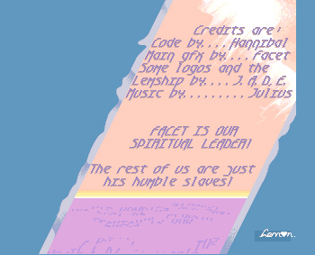 Comment pourrais je oublier les mois passés sur Deluxe Paint à dessiner pixel par pixel les graphismes dont le groupe avait besoin, les nuits passées où nous étions tous rassemblés pour CREER ! Avec le recul, je dois dire que j'y ai consacré toute mon adolescence, mais quels souvenirs ! Aujourd'hui c'est la larme à l'oeil que je revois toutes ces merveilles mais.. qui sait... peut être un jour le phœnix renaîtra de ses cendres... Hiro / LiQuiD... << ONLY AMIGA MAKES IT POSSIBLE >>