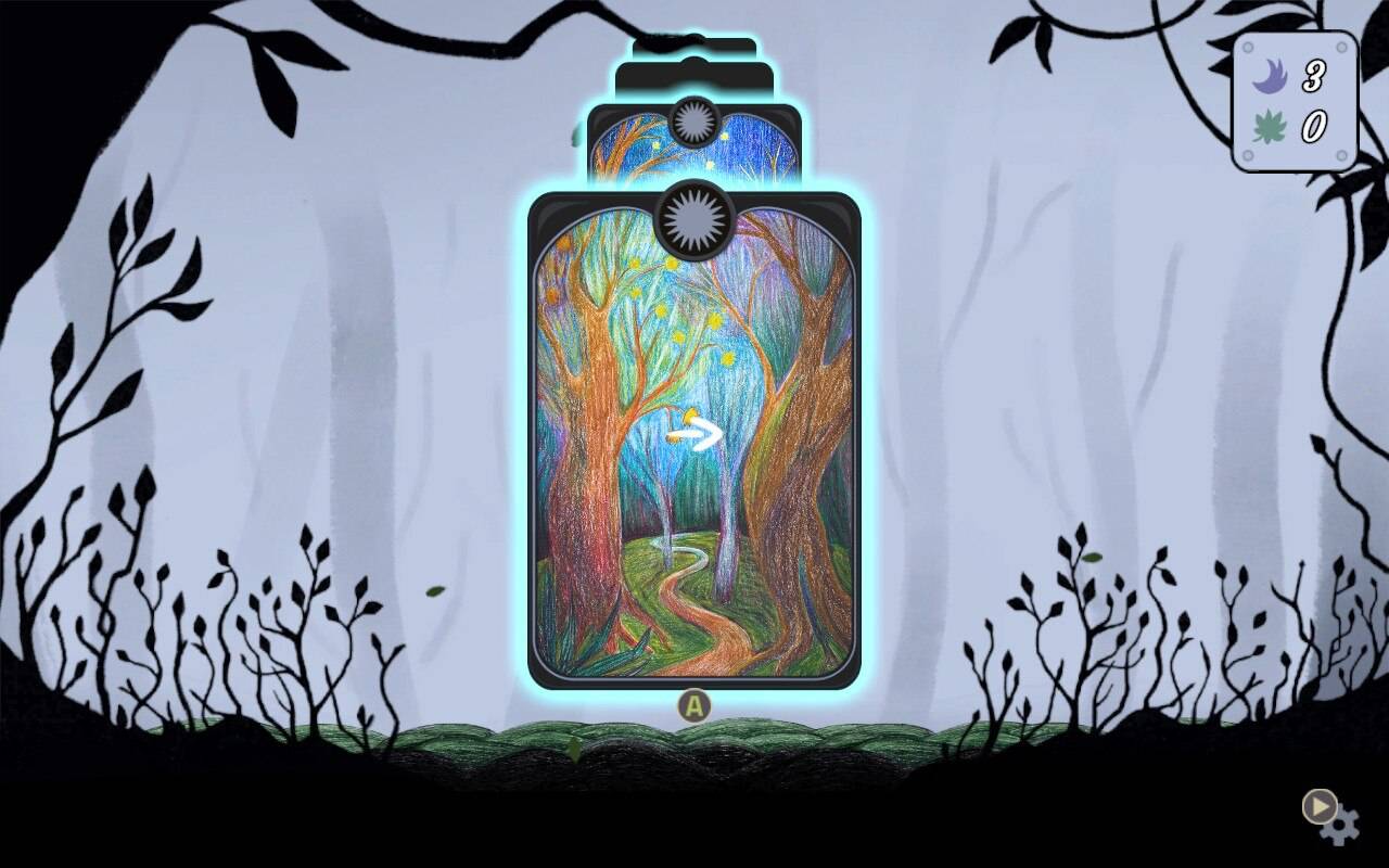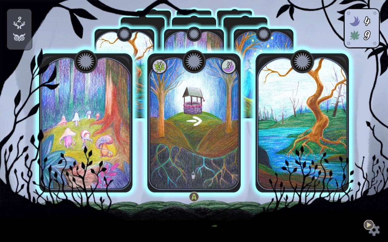Le début de DruidWalker est plutôt rugueux : vous êtes balancé dans le jeu sans introduction, sans tutoriel, rien du tout. La seule chose que vous savez, c'est que vous incarnez un druide et que vous allez vous promener en forêt. Le jeu se présente sous forme de cartes, et raconte son histoire. On peut penser à un deck building, mais ce n'est pas ça. On peut penser à un jeu narratif à la Foretales, mais ce n'est pas sans non plus.