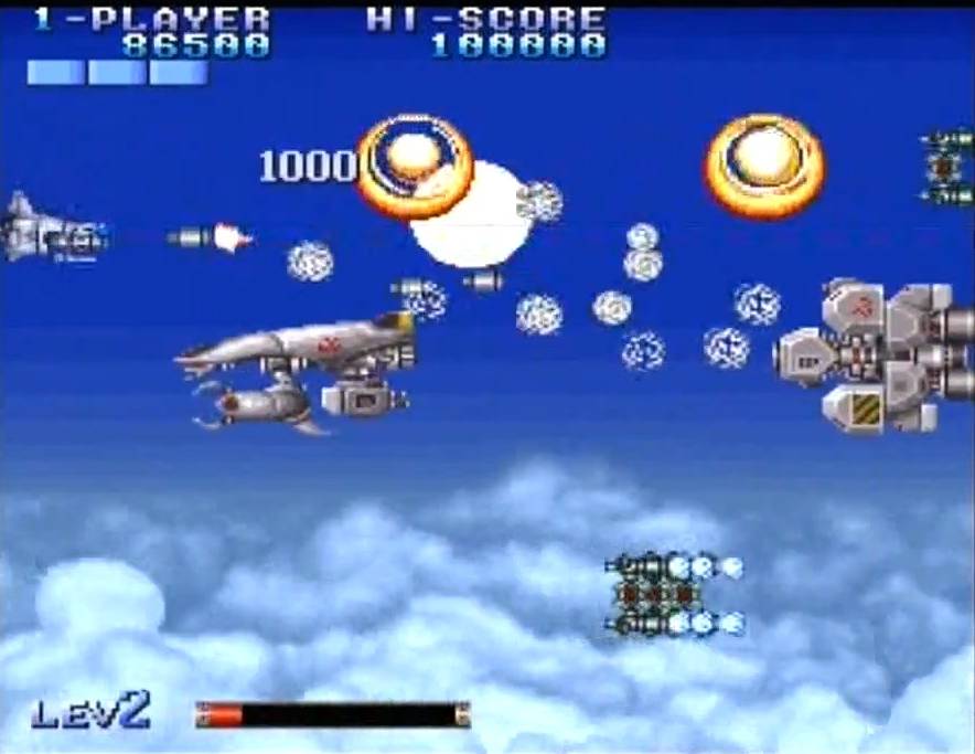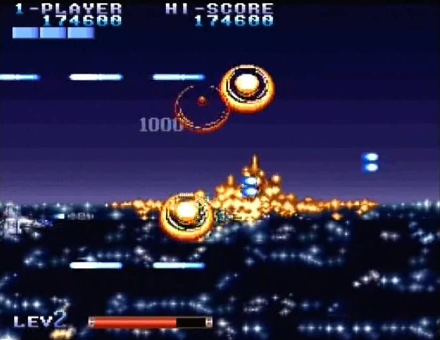 Côté armement, la progression des armes est plutôt originale, puisqu'elle est liée au score. Plutôt que de laisser des items, les ennemis rapportent juste des points. Ces derniers alimentent votre score, bien entendu, mais font également monter votre barre d'expérience. Quand elle est pleine, vous passez au niveau supérieur et bénéficiez d'une meilleure force de frappe.
