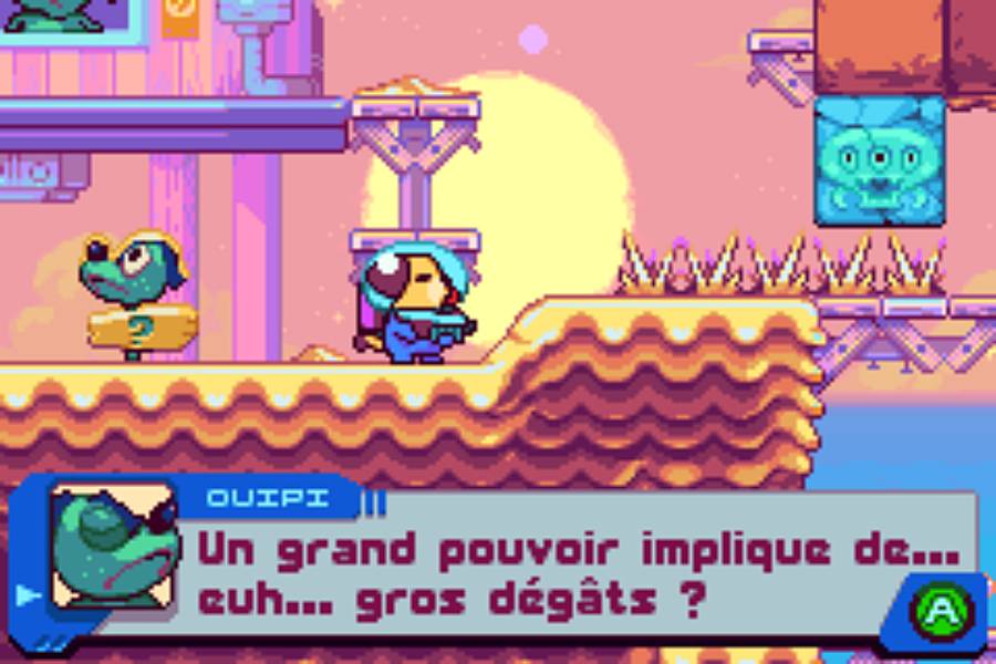 En plus de son aventure palpitante et ultra rafraichissante, Goodboy Galaxy nous en met plein les yeux. C'est super beau, coloré et particulièrement bien animé. Il n'y a pas ce côté déjà-vu que l'on trouve dans tant de productions homebrew. D'ailleurs, le jeu est tellement bien foutu, bien produit, que j'ai énormément de mal à le considérer comme un homebrew. Pour moi, il fait totalement partie de la ludothèque de la Game Boy Advance. Il fait même partie de ses indispensables !