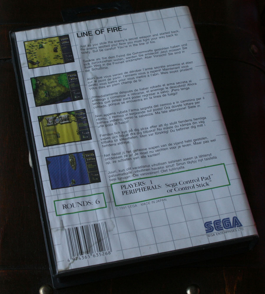 Line of Fire est un shoot'em up assez peu connu sur Master System. Il dispose pourtant d'une particularité qui le démarque clairement des autres : il est compatible avec les lunettes 3D de la Master System.Line of Fire, c'est avant tout un jeu d'arcade développé par Sega et sorti en 1989. Comme on va le voir, cette version Master System, adaptée par Sanritsu Denki, est très différente de son homologue arcade. Cette dernière proposait une vue subjective pour un vrai shooter. Ici, on passe en vue du dessus pour un shoot'em up beaucoup plus classique pour l'époque.