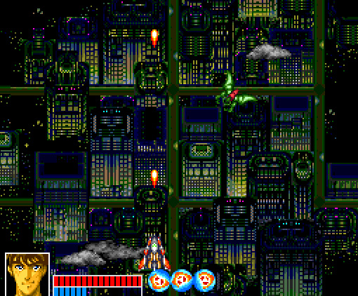 Vous disposez d'une arme principale et d'une autre secondaire. Liées au même bouton, vous tirez tout en même temps. Là où Psychic Storm se démarque des autres shoots, c'est au niveau des armes spéciales. On en trouve deux, la première est une smart bomb classique, avec toutefois la particularité de monter via une barre de "spécial", un peu comme dans un versus fighting.