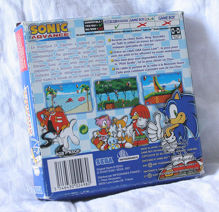 Sonic arrive sur la portable de Nintendo dans une aventure purement 2D qui rappelle avec émotion l'ambiance des épisodes 16 bits.Sonic Advance fait partie des premiers jeux made in Sega à arriver sur une console Nintendo. Pour les habitués qui ont grandi aux côtés des Master System et autres Nes, Super Nintendo ou Megadrive, c'est un choc de voir notre hérisson sur la console du plombier à la salopette bleue !
