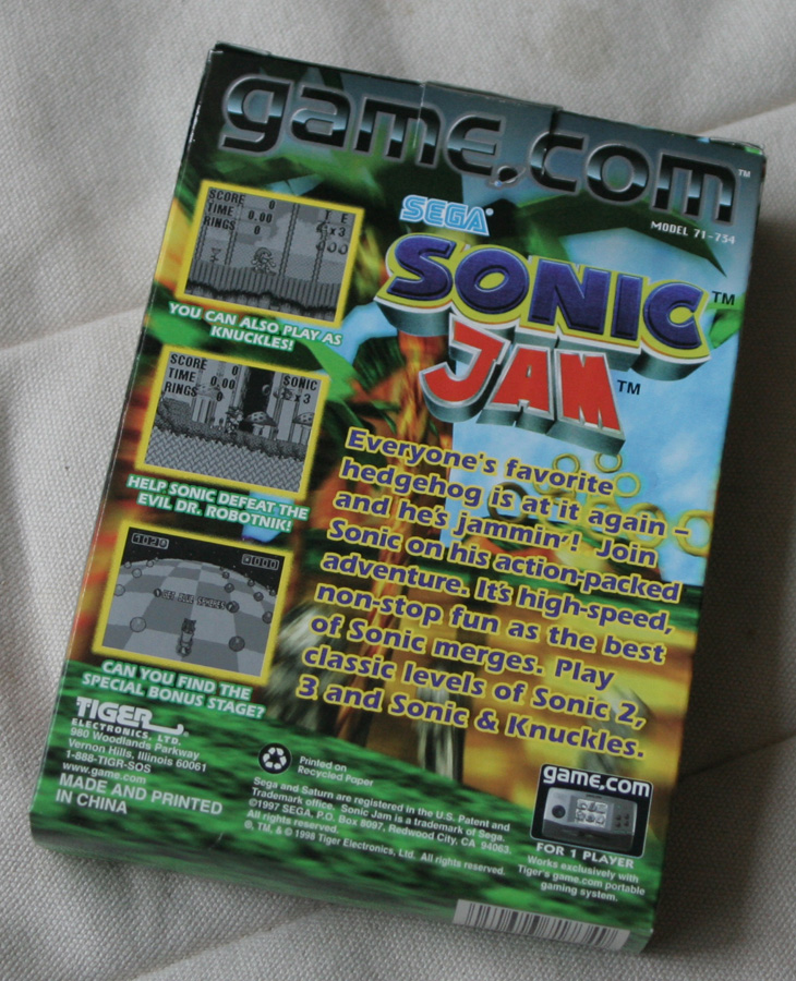 Sonic Jam est surtout connu sur Saturn. Pourtant, une version Game.com a vu le jour... Et vu le support, vous ne vous étonnerez pas que cela soit de la merde en barre.A la base, Sonic Jam est une compilation sortie sur Saturn et regroupant les quatre premiers épisodes de Sonic sur Megadrive (Sonic 1, 2, 3 et Sonic & Knuckles).