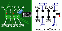Comme d'habitude, démontez la chose, retirez une bonne fois pour toute la tôle et faites attention de pas vous brûler sur le dissipateur (la plaque brillante, en 5 minutes elle est bouillante). Précision importante: il faut DEBRANCHER l'alimentation avant de souder quoi que ce soit, SINON CA RISQUE DANGEREUSEMENT DE GRILLER LE CONTROLLEUR VIDEO (c'est vrai que ça marche légèrement mieux quand il est en état...). Repérez les plots de configuration (c'est comme des soudures pas finies) sur le circuit principal (voir schéma 1.1) et couper les pistes qui relient JP3 et JP4 au plot PAL, et JP2 et JP1 au plot EURO (IL FAUT COUPER LES PISTES AU CUTTER COMME INDIQUE PAR LES LIGNES ROUGES SUR LE SCHEMA, ET BIEN L'ENFONCER -bien profond- C'EST TRES IMPORTANT!!! En effet, si vous ne coupez pas les pistes correctement, cela fera un cour-cicruit et fera très probablement griller votre console. Par ailleurs faites attention à ne pas défoncer les pistes adjacentes. Afin d'être certain de ne pas faire d'erreur, il convient de tester les pistes avec un testeur de continuité positionné en hom-mètre). La signification des plots sont sur le schéma 1.2: