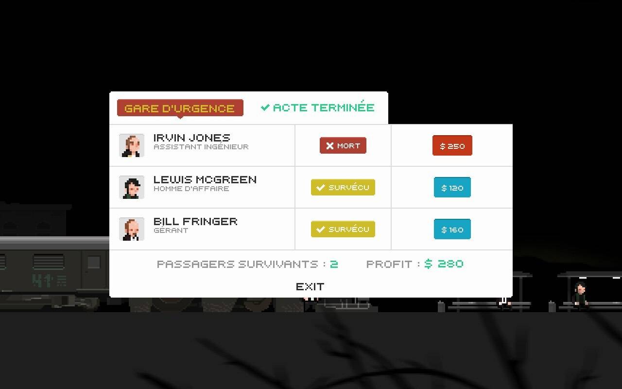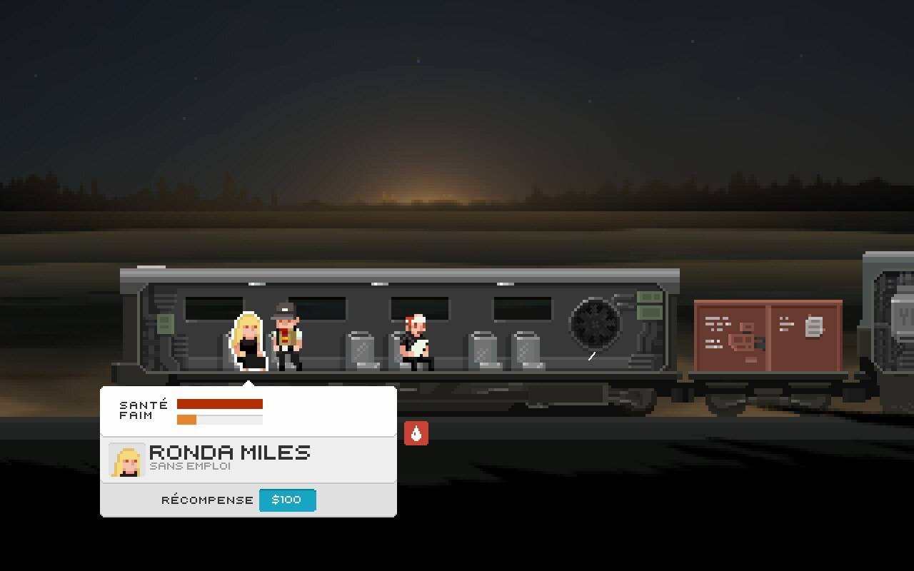 Dans chaque gare, vous trouvez des survivants qui peuvent vous accompagner dans le train. Vous devez alors prendre soin d'eux et surveiller leurs jauges de vie et de nourriture. Vous pouvez leur donner des rations que vous trouverez dans les gares ainsi que des medikits... que vous pouvez utiliser vous-mêmes. Le dilemme ! Les utiliser pour vous ou pour tenter de faire survivre le plus de passagers possible ?